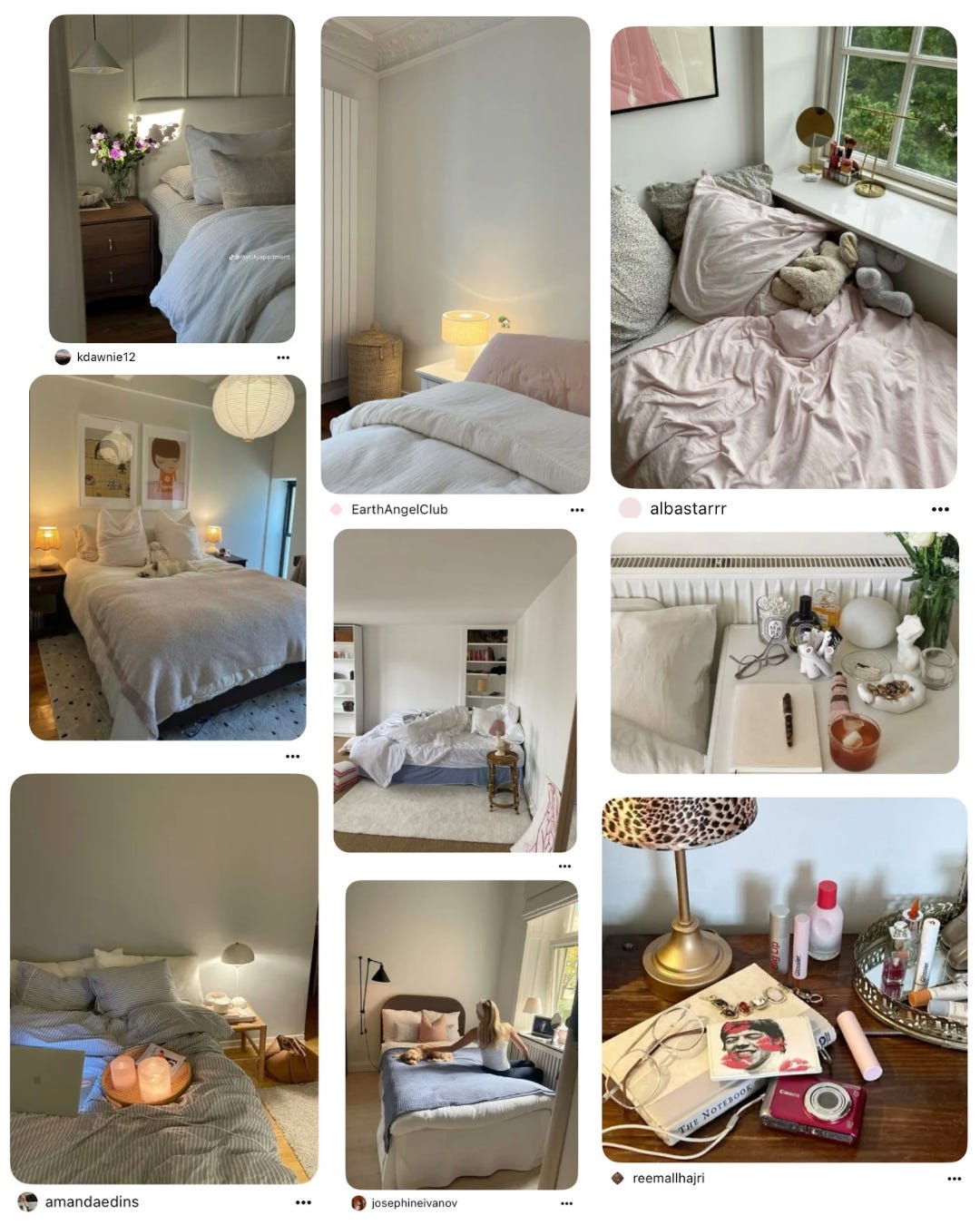 Nowadays, what was once a private process of self expression, is put on display in new ways, not only through social media. The site of the bedroom has become a figurative stage, the place our online performativity flows from. Instagram photo dumps neatly crafted from your bed, dating app swipes, TikTok reposts. As consequence, the bedroom becomes embroiled in the wider creation and romanticisation of our online-selves, of how we want to be perceived by others. Rather than a space to navigate our inner selves, it often becomes a performance of a certain, replicable online-based aesthetic: cottagecore, coquette, dark academia, clean girl, vanilla girl, coastal grandmother etc.